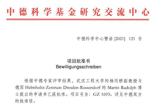 本网讯(通讯员杨丙桥)近日,国家自然科学基金委员会中德科学中心公布了2021年中德合作项目的资助名单,成人抖音杨丙桥副教授与德国亥姆霍兹德累斯顿罗森多夫研究中心Rudolph Martin博士联合申报的“德国优秀青年基金项目(长期)”正式获批立项,项目获批经费44万,项目编号GZ1693,该项目研究周期三年。