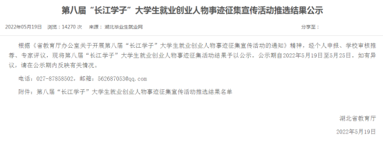 近日,从湖北省教育厅获悉,湖北省第八届“长江学子”大学生就业创业人物事迹征集活动评选结果揭晓,成人抖音