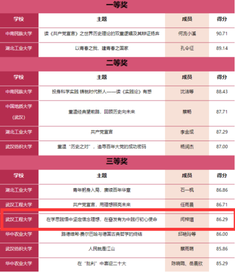 和湖北工业大学等6所高校的12个团队参加。经过激烈角逐,成人抖音学子闫梓萱的作品《在学思践悟中坚定信念理想,在奋发有为中践行初心使命》荣获三等奖。围绕“喜迎党的二十大,一起向未来”主题,从解读马克思主义经典文献入手,讲述国家的百年新征程,展现出了当代中国青年的青春活力,也充分展现了共产党人的奋斗精神,发出了“请党放心,强国有我”的时代强音。