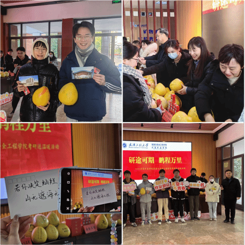领导、班主任为考研学子发放写满祝福语的加“油”柚,寓意成功的旺仔牛奶和加油卡片,鼓励他们在最后的时刻保持好心态,抓住机会、迎难而上,努力实现考研梦想。