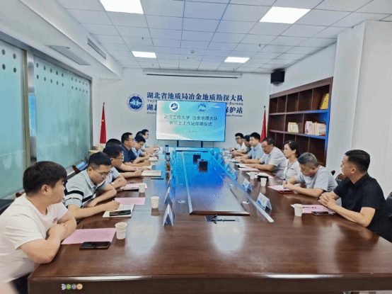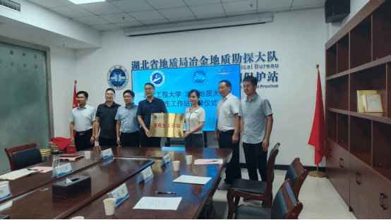 副院长周芳教授、采矿工程教研室张龙老师及一名研究生赴湖北省地质局冶金地质勘探大队(以下简称“冶金地质大队”)开展产学研合作洽谈活动暨研究生工作站揭牌仪式。冶金地质大队党委书记、队长杨潇,副队长王水华,副队长石威,十堰环境地质中心主任于义军,黄石环境地质中心主任陈伯恒等参加座谈交流会。黄石市自然资源和规划局开发区·铁山区分局副局长王福彬,地灾科长杨燕翔等列席座谈会。
