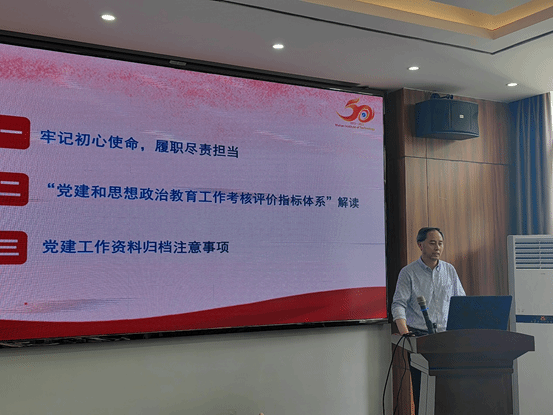 江本武从党支部的基本任务、党支部的主要职责、组织生活、党支部委员会建设、党支部书记的职责几个方面进一步细化了党支部的相关工作,他指出支部工作要坚持以思想政治建设为根本、以服务中心工作为出发点、以党员队伍建设为抓手,通过落实“三会一课”、创新活动组织形式推动支部建设,以意识的强化带动行动的进步,破解“工作”“党建”两张皮的问题。