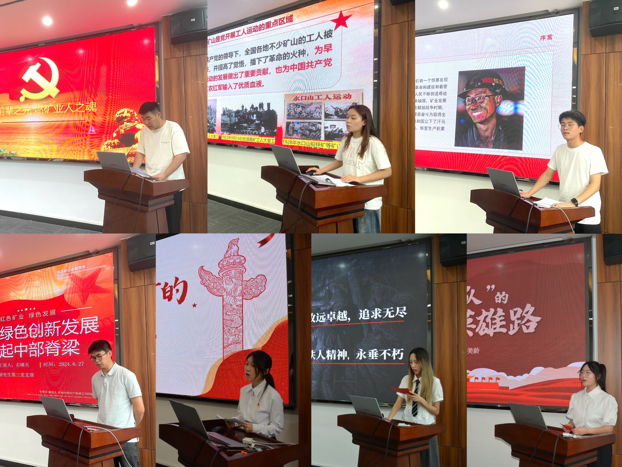举办了“红色矿业 绿色发展”主题微党课比赛,共有来自7个学生党支部的14名党员参赛,他们围绕功勋矿山的故事、矿业人的劳模精神、矿山的绿色转型发展历程等话题,以图文并茂的形式奉献了一场有滋有味、有声有色的精彩矿业史“微党课”,充分展现了作为矿业学子的专业素养和家国情怀。他们在比赛中号召要立志成为“知矿业、学矿业、爱矿业、干矿业”的新时代国家矿业接班人。