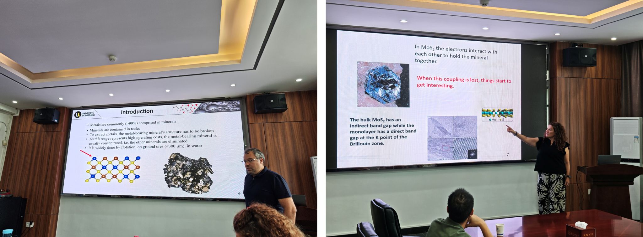 李洪强教授主持。Badawi教授以“基于机器学习与分子动力学相结合的浮选过程研究”为题,深入介绍了人工智能与分子模拟在矿物浮选机理研究中的前沿进展,强调了多学科融合对提升资源利用效率的重要意义;Quintana教授则以“将二维材料融入环保应用的若干策略”为题,结合自身研究成果,系统阐释了二维材料在环境治理与绿色能源领域的应用潜力,展示了新材料为应对环境挑战提供的新路径。两位教授的精彩报告内容丰富、视野开阔,为师生带来一场学术盛宴。