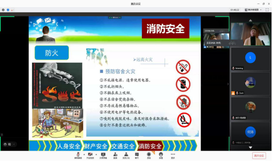 孙奕带领大家学习了校园安全的相关事宜。就大学生的人身安全、财产安全、交通安全和消防安全做了全面的讲解,指出安全不是小事,每个人都不能麻痹大意。每个同学都要负起应有的责任,第一时间把安全放在心上,切实保证自己的人身安全以及财产安全。