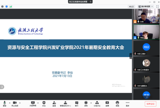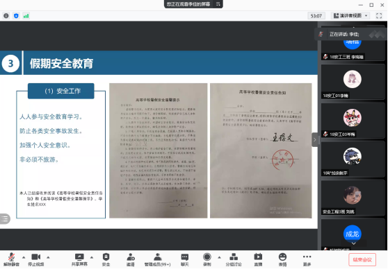 李佳宣讲了2021年暑假的相关通知及规定,讲解了成人抖音 关于开展“学习习近平总书记在庆祝中国共产党成立100周年大会上的重要讲话精神”和2021年大学生志愿者暑期文化科技卫生“三下乡”社会实践活动相关要求,结合学校下发的《高等学校暑假安全责任告知书》集中开展了人身安全、消防安全、实验室安全、防网络、电信诈骗、防意外伤害、防溺水等方面的教育,并针对本科生和研究生的不同层次、不同年级的学业政策、日常管理规定做了一一的解读。