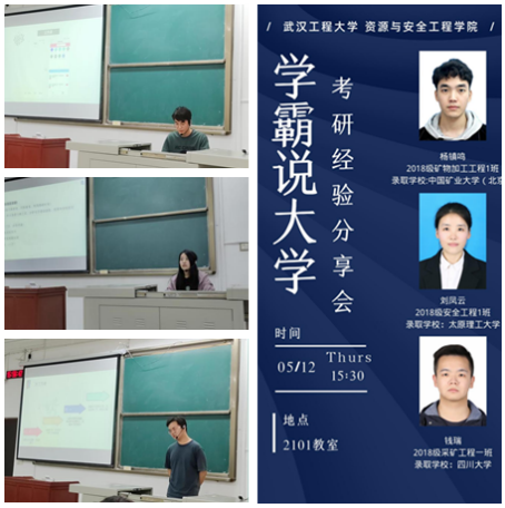 第四届“学霸说大学”系列分享会之考研经验分享会在武昌校区W2101教室顺利举办。本次分享会邀请了2018级矿物加工工程专业杨镇鸣、2018级安全工程专业的刘凤云和2018级采矿工程专业的钱瑞担任分享人。成人抖音