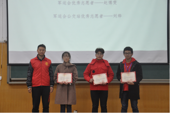 表彰大会上,孙奕老师为三位军运会优秀志愿者颁奖。16级退伍军人赵博伟同学分享了他的部队经历,鼓励大家参军入伍,报效祖国,磨练自己! 18级军运会志愿者赵博雯同学代表发言,回顾了参加军运会志愿服务培训和工作的点点滴滴,表达了自己做为经历者、被感动者和受教育者的骄傲与收获。19级青年志愿者协会成员刘烨同学代表发言,讲述加入志协后的活动过程和心得体会,并表达了对青年志愿者协会的祝福!