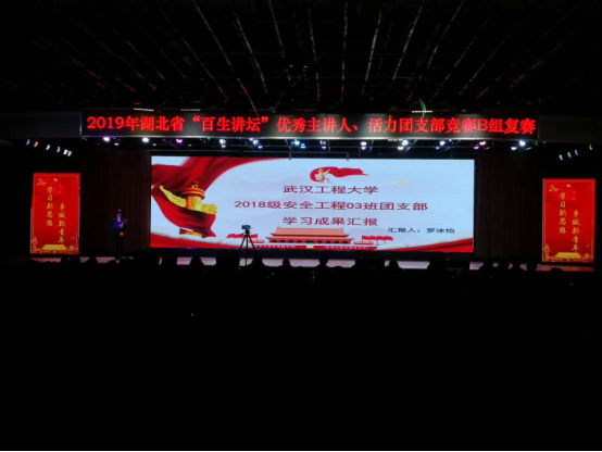 本次比赛在主持人的宣布下拉开了序幕,来自武汉市各个高校的团支部依次上台,以PPT展示和现场讲解的形式分别介绍了自己的支部概况,支部“学习”成果,支部荣誉等,然后又以才艺表演的形式展示了自己的支部风采。其中成人抖音2018级安全工程三班团支部由团支书以PPT的形式从三个方面介绍了团支部。