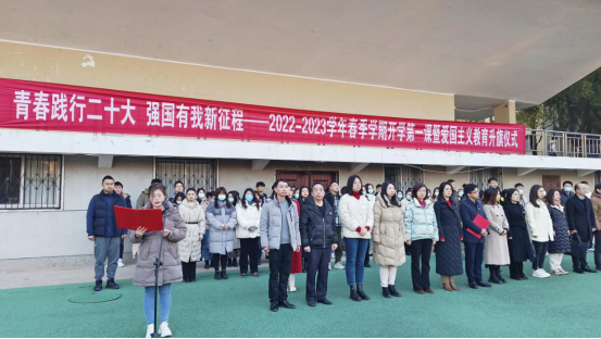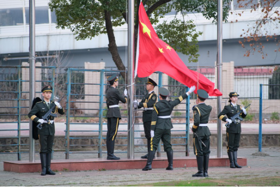 迎着初春朝阳,国旗班迈着铿锵有力的步伐,护送鲜艳的五星红旗进场。在雄壮的《义勇军进行曲》伴随下,五星红旗冉冉升起,迎风飘扬,熠熠生辉。全体师生奏唱国歌,向国旗行注目礼。