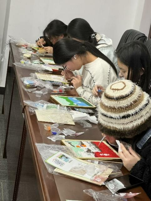 随后,进入手工制作环节。此次活动特别准备了玻璃灯画、马赛克杯垫以及非遗纸浆画三项内容供同学们选择体验。每一种手工制品都蕴含着深厚的文化底蕴,参与者们分组合作,用心地将材料组合成一幅幅精美的作品,每一笔、每一画都倾注了他们对传统文化的热爱。